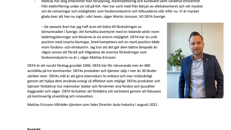 - De senaste åren har jag kunnat bidra till förändringar av bilmarknaden i Sverige. Att fortsätta äventyret med en ledande aktör inom laddningslösningar och bilvärme är en enorm möjlighet. DEFA har en unik position med smarta lösningar, bred kompetens och en stark position både inom fordons- och elindustrin. Jag tror att det gör dem bättre lämpade än någon annan att förstå och tillgodose de enorma förändringarna som fordonsindustrin nu är i, säger Mattias Ericsson