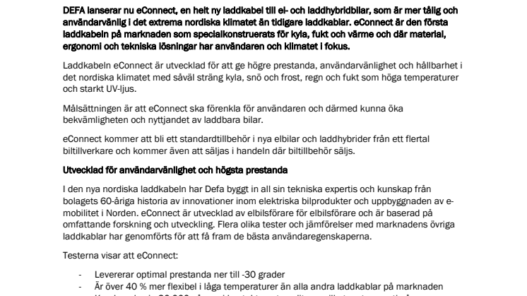I den nya nordiska laddkabeln har Defa byggt in all sin tekniska expertis och kunskap från bolagets 60-åriga historia av innovationer inom elektriska bilprodukter och uppbyggnaden av e-mobilitet i Norden. eConnect är utvecklad av elbilsförare för elbilsförare och är baserad på omfattande forskning och utveckling. Flera olika tester och jämförelser med marknadens övriga laddkablar har genomförts för att få fram de bästa användaregenskaperna.