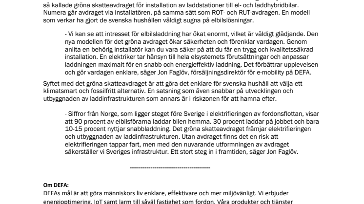 - Vi kan se att intresset för elbilsladdning har ökat enormt, vilket är väldigt glädjande. Den nya modellen för det gröna avdraget ökar säkerheten och förenklar vardagen. Genom anlita en behörig installatör kan du vara säker på att du får en trygg och kvalitetssäkrad installation. En elektriker tar hänsyn till hela elsystemets förutsättningar och anpassar laddningen maximalt för en snabb och energieffektiv laddning. Det förbättrar upplevelsen och gör vardagen enklare, säger Jon Faglöv, försäljningsdirektör för e-mobility på DEFA.