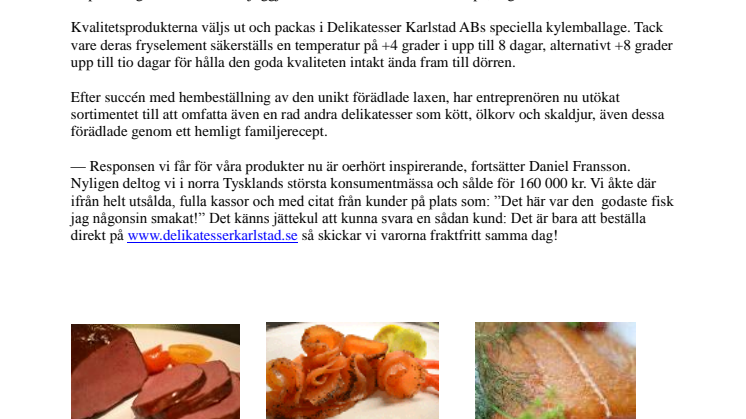 — Responsen vi får för våra produkter nu är oerhört inspirerande, fortsätter Daniel Fransson. Nyligen deltog vi i norra Tysklands största konsumentmässa och sålde för 160 000 kr. Vi åkte där ifrån helt utsålda, fulla kassor och med citat från kunder på plats som: ”Det här var den godaste fisk jag någonsin smakat!” Det känns jättekul att kunna svara en sådan kund: Det är bara att beställa direkt på www.delikatesserkarlstad.se så skickar vi varorna fraktfritt samma dag!