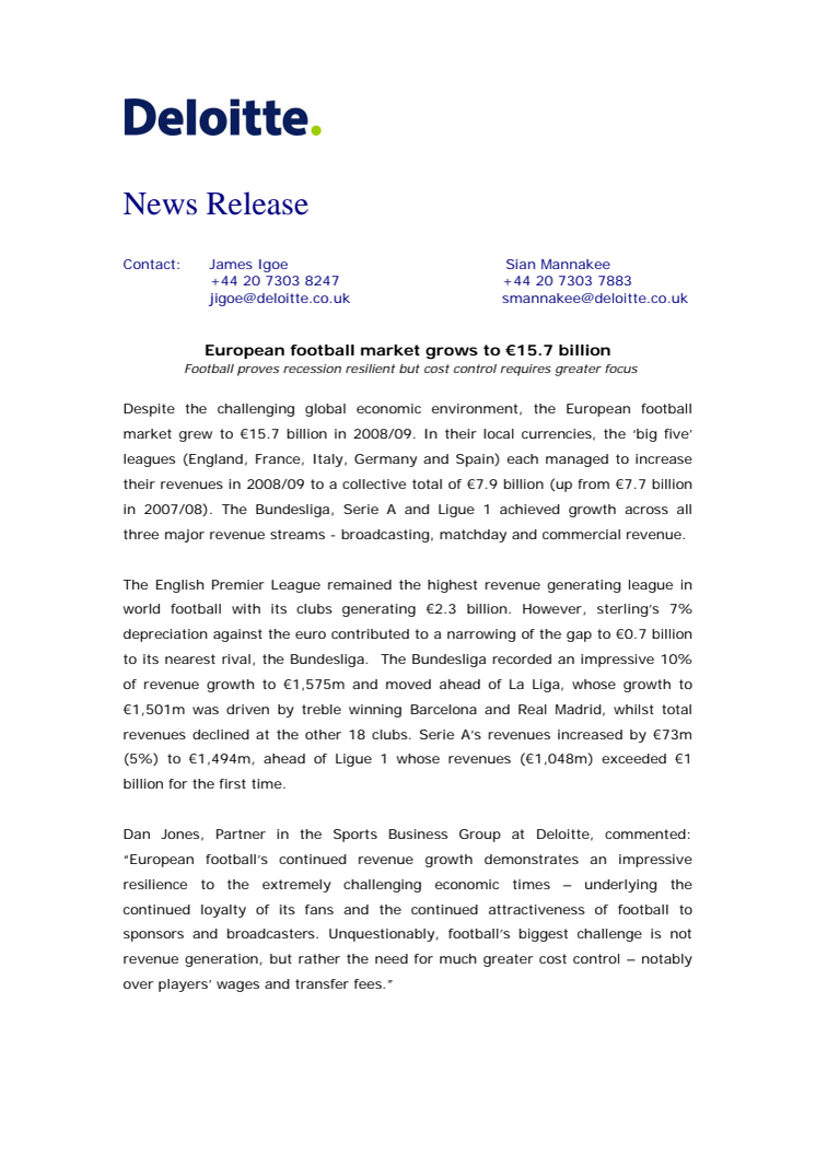 Den europeiska fotbollsmarknaden har trots allmän ekonomisk nedgång, vuxit till 151 miljarder kronor säsongen 2009. Snabbast växande är den tyska Bundesliga som nu omsätter över 15 miljarder kronor. Det visar den årliga rapporten från revisions- och konsultföretaget Deloitte.