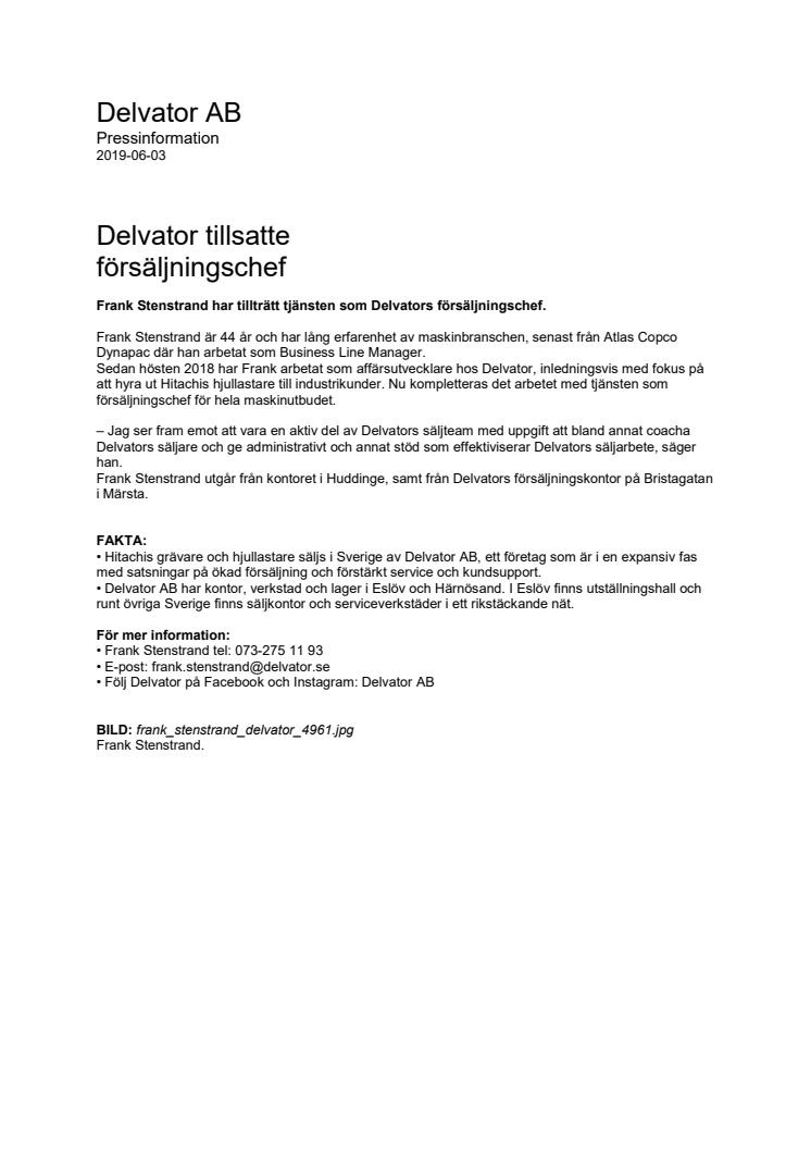 Frank Stenstrand har tillträtt tjänsten som Delvators försäljningschef.