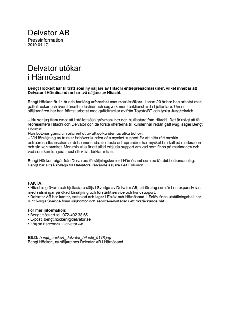 Bengt Höckert har tillträtt som ny säljare av Hitachi entreprenadmaskiner, vilket innebär att Delvator i Härnösand nu har två säljare av Hitachi.