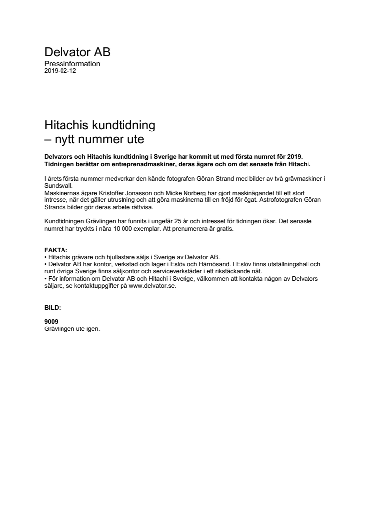 Delvators och Hitachis kundtidning i Sverige har kommit ut med första numret för 2019. Tidningen berättar om entreprenadmaskiner, deras ägare och om det senaste från Hitachi.