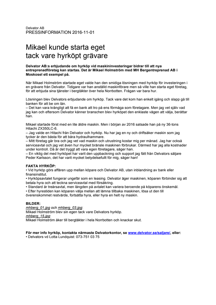 Mikael Holmström kunde starta eget företag, tack vare Delvator AB:s erbjudande om hyrköpt grävmaskin.