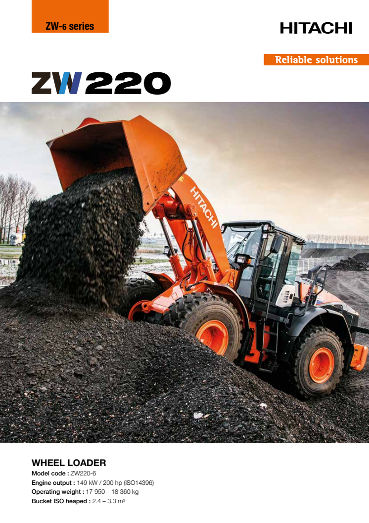 Produktbroschyr med specifikation, Hitachi hjullastare ZW220-6 som säljs i Sverige av Delvator AB.