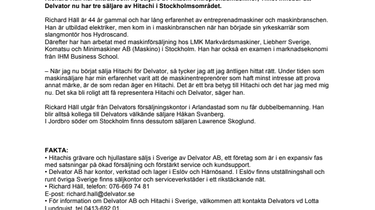 Richard Häll har tillträtt som ny säljare av Hitachi entreprenadmaskiner, vilket innebär att Delvator nu har tre säljare av Hitachi i Stockholmsområdet.