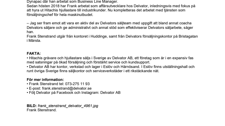 Frank Stenstrand har tillträtt tjänsten som Delvators försäljningschef.