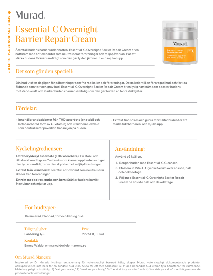 Återställ hudens barriär under natten med nya Essential-C Overnight Barrier Repair Cream från Murad