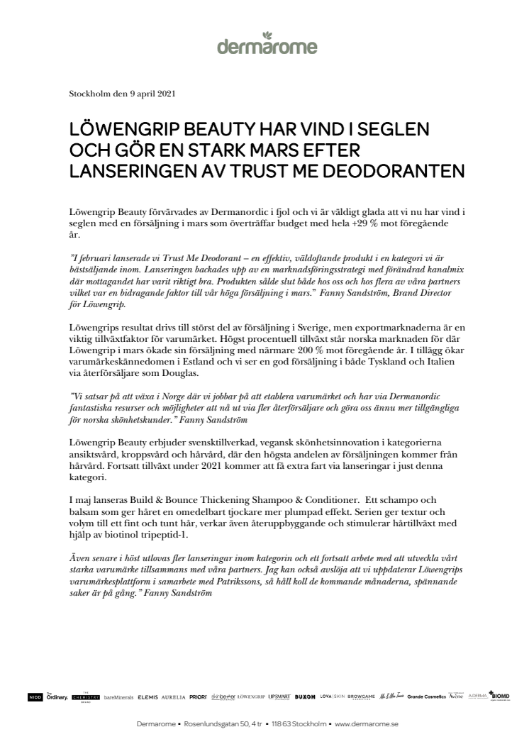 ”I februari lanserade vi Trust Me Deodorant – en effektiv, väldoftande produkt i en kategori vi är bästsäljande inom. Lanseringen backades upp av en marknadsföringsstrategi med förändrad kanalmix där mottagandet har varit riktigt bra. Produkten sålde slut både hos oss och hos flera av våra partners vilket var en bidragande faktor till vår höga försäljning i mars.” Fanny Sandström, Brand Director för Löwengrip.