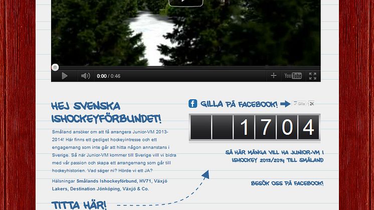 Kampanjen "JVM till Småland" www.jvmtillsmaland.nu är nominerad till Svenska Webbpriset. Det är Smålands ansökan om att få arrangera Junior-VM i hockey 2013/14 som nu uppmärksammas nationellt.