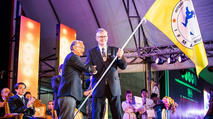 Det var högtidligt när den officiella VM-flaggan på söndagseftermiddagen lämnades över av Thailands turist- och idrottsminister till presidenten för det internationella Muaythaiförbundet. Till tonerna av musik från den thailändska militärens musikkår räckte han sedan vidare flaggan till Anders Hulusjö, kommunfullmäktiges ordförande i Jönköping, och Dilani Perera från den svenska ambassaden.