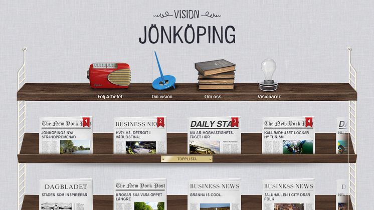 På Visionjonkoping.se kan vem som helst skapa sin vision om vad man vill läsa om Jönköping i tidningarna i framtiden. Sajten är byggd som en tidningshylla och varje tidningsrubrik går att hissa, dissa och dela. Tidningsrubrikerna har använts som input till visionsarbetet där varumärket Jönköping ska vitaliseras.