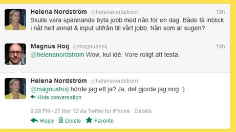 Hur skulle en Stockholmare i mediabranschen marknadsföra Jönköping? Hur skulle en platsmarknadsförare från Jönköping leda en av Sveriges största branschtidningar? Det vill Magnus Höij, chefredaktör på Internetworld och Helena Nordström, marknadschef på Destination Jönköping ta reda på. Under april gästspelar de på varandras arbetsplatser.