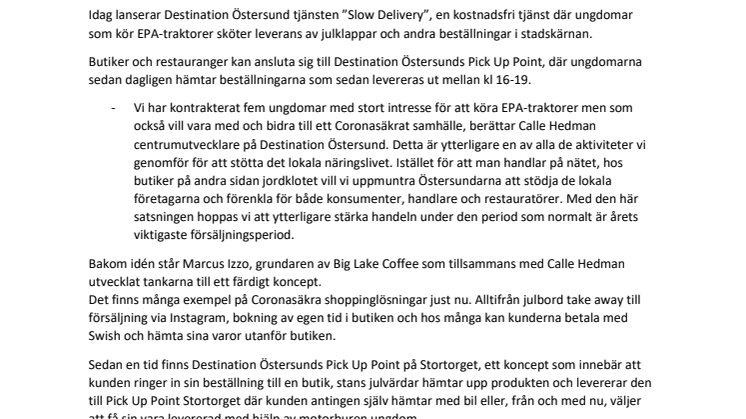 Idag lanserar Destination Östersund tjänsten ”Slow Delivery”, en kostnadsfri tjänst där ungdomar som kör EPA-traktorer sköter leverans av julklappar och andra beställningar i stadskärnan.