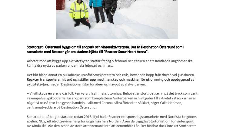 Stortorget i Östersund byggs om till snöpark och vinteraktivitetsyta. Det är Destination Östersund som i samarbete med Reaxcer gör om stadens hjärta till ”Reaxcer Snow Heart Arena”.