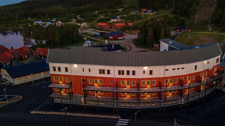 Större och lyxigare i fem våningar med 39 nya dubbelrum, 12 förstklassiga lägenheter, stor konferensavdelning, gym, restaurang, spa och relaxavdelning med fantastisk panoramautsikt över skidbackar, fjäll och sjö.