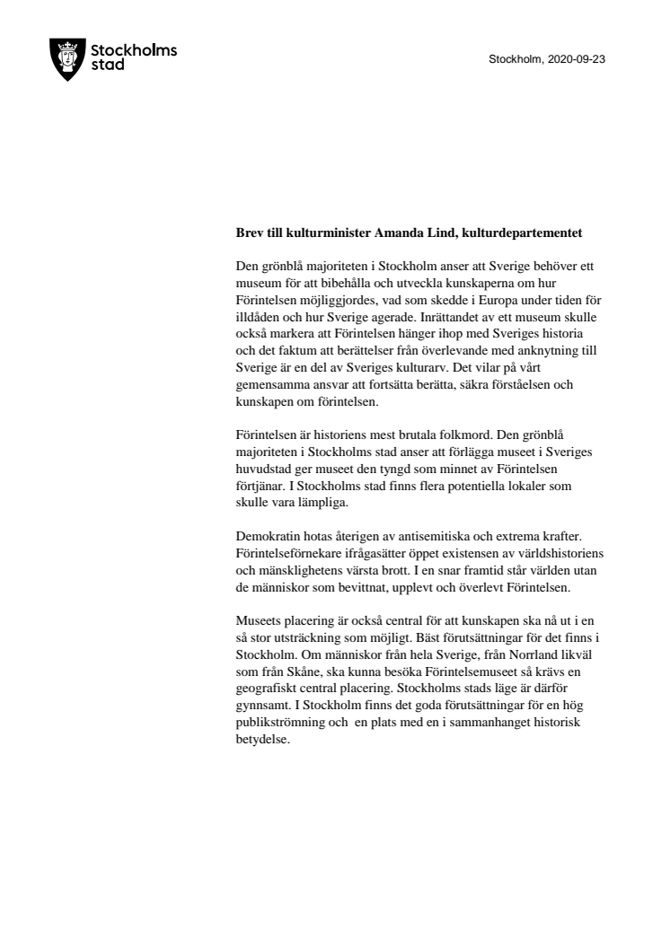 Brev till kulturminister Amanda Lind, kulturdepartementet