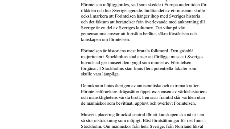 Den grönblå majoriteten i Stockholm: ”Förintelsemuseet bör placeras i huvudstaden”