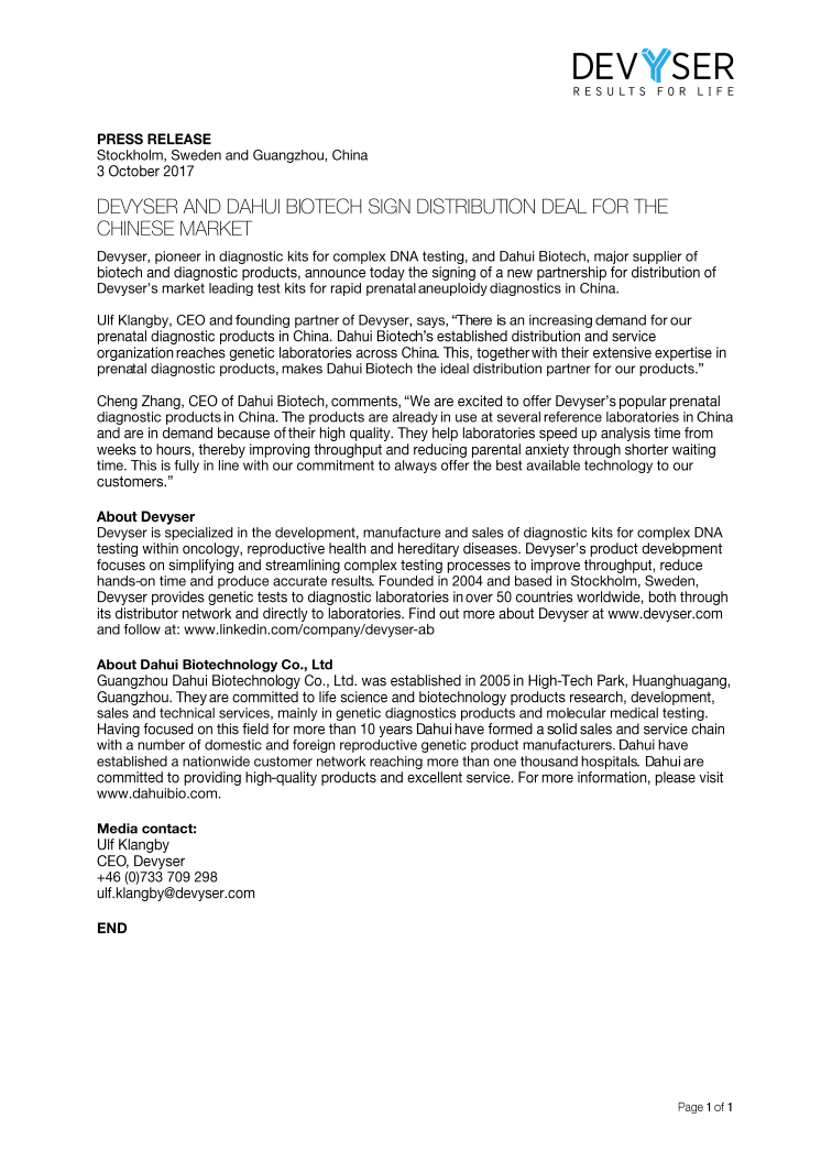 Devyser, pioneer in diagnostic kits for complex DNA testing, and Dahui Biotech, major supplier of biotech and diagnostic products, announce today the signing of a new partnership for distribution of Devyser’s market leading test kits for rapid prenatal aneuploidy diagnostics in China.