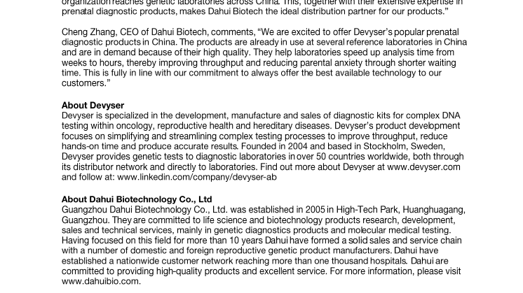 Ulf Klangby, CEO and founding partner of Devyser, says, “There is an increasing demand for our prenatal diagnostic products in China. Dahui Biotech’s established distribution and service organization reaches genetic laboratories across China. This, together with their extensive expertise in prenatal diagnostic products, makes Dahui Biotech the ideal distribution partner for our products.”