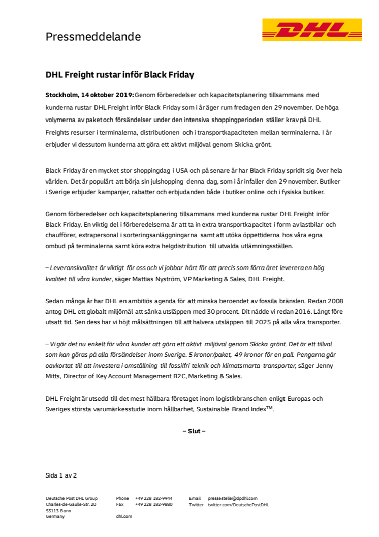 Genom förberedelser tillsammans med kunderna rustar DHL Freight inför Black Friday som i år äger rum den 29 november. De höga volymerna av paket och försändelser under den intensiva shoppingperioden ställer krav på DHL Freights resurser i terminalerna, distributionen och i transportkapaciteten mellan terminalerna. I år erbjuder vi också kunderna att göra ett aktivt miljöval genom Skicka grönt.