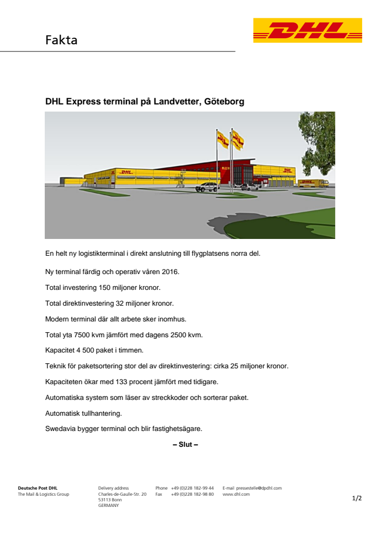 DHL Express avslöjar idag sin nya mångmiljoninvestering i Sverige. I ett första skede byggs en helt ny terminal på Landvetter flygplats i Göteborg. I ett senare skede följer nya terminaler i Stockholm, både på Arlanda flygplats och i Västberga. Detta stärker företagets position på marknaden betydligt och ger kunderna fördelar, bland annat med snabbare leveranser.