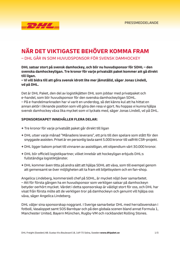 När det viktigaste behöver komma fram – DHL går in som huvudsponsor för svensk damhockey