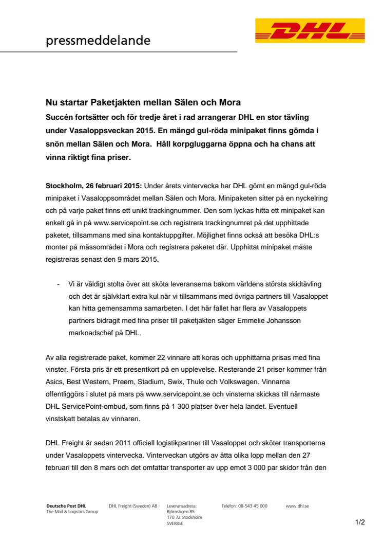 Under årets vintervecka 2015 har DHL gömt en mängd gul-röda minipaket i Vasaloppsområdet mellan Sälen och Mora. Minipaketen sitter på en nyckelring och på varje paket finns ett unikt trackingnummer. Registrera numret på www.servicepoint.se och ha chans att vinna fina priser. DHL finns på plats hela veckan i montern på Vasaloppsveckan.