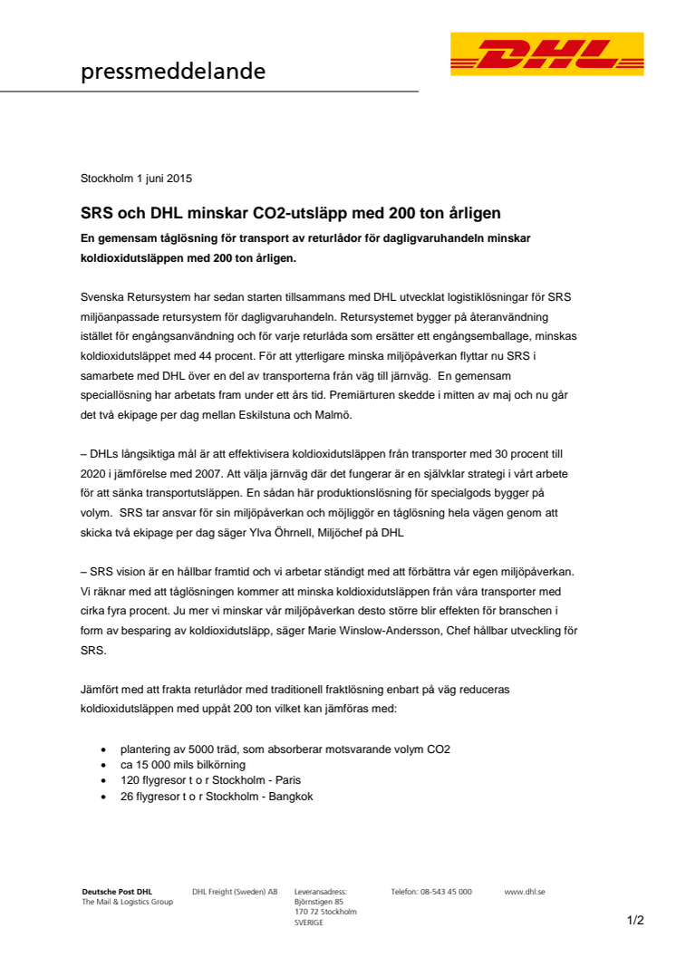 För att minska miljöpåverkan flyttar nu SRS i samarbete med DHL över en del av transporterna från väg till järnväg.Jämfört med att frakta returlådor med traditionell fraktlösning enbart på väg reduceras koldioxidutsläppen med 200 ton årligen.