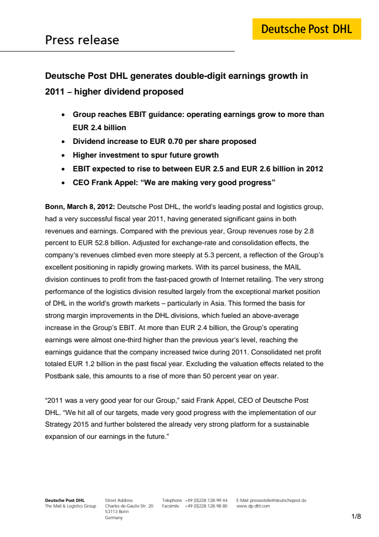 Världens ledande logistikföretag Deutsche Post DHL hade ett lyckosamt räkenskapsår 2011, efter att ha skapat betydande vinster både vad gäller intäkter och resultat. Utdelning föreslås öka till 0,70 euro per aktie.