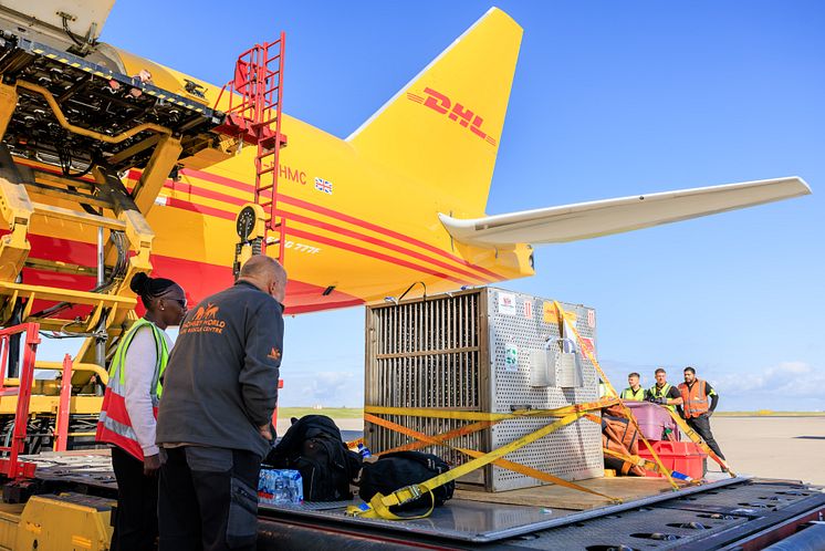 Chocolat leaving the DHL aircraft at EMA, accompanied by her animal attendants, Monicah and Jeremy.jpg