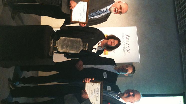 Bildtext: Prisutdelning av Ecologistic Award. Från vänster: Owe Andersson, Europark, Catherine Löfquist, Bring Express samt juryns ordförande, Johan Lood, DHL Global Forwarding och Thomas Cassel, Swedavia.