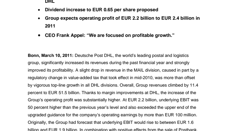 Bonn, 14 mars, 2011 - Världens ledande logistikkoncern Deutsche Post DHL ökade sin intäkt och lönsamhet avsevärt under 2010, och samtliga DHL-divisioner visar upp en hälsosam försäljningstillväxt. Totalt sett ökade koncernens intäkter med 11,4 procent till 51,5 miljarder euro. Tack vare DHL:s förbättrade marginaler ökade koncernens rörelsevinst avsevärt. Med 2,2 miljarder euro var resultatet före skatt (EBIT) 50 procent högre jämfört med föregående år, och överträffade också det reviderade resultatmålet för företagets rörelsevinst med över 100 miljoner euro. Koncernen hade tidigare förutspått att EBIT skulle öka till mellan 1,6 och 1,9 miljarder euro. I kombination med positiva effekter från försäljningen av Postbank, resulterade effektiviseringsförbättringar i en fyrfaldig ökning av årets resultat till 2,5 miljarder euro för 2010.