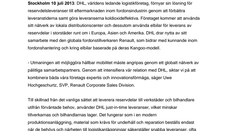 Stockholm juli 2013: DHL, världens ledande logistikföretag, förnyar sin lösning för reservdelsleveranser till eftermarknaden inom fordonsindustrin genom att förbättra leveranstiderna samt göra leveranserna koldioxideffektiva. Företaget kommer att använda sitt nätverk av lokala distributionscenter och dessutom använda elbilar för leverans av reservdelar i storstäder runt om i Europa, Asien och Amerika. DHL drar nytta av sitt samarbete med den globala fordonstillverkaren Renault, som bidrar med kunnande inom fordonshantering och kring elbilar baserade på deras Kangoo-modell.