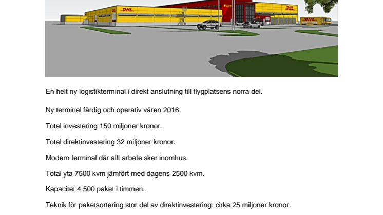 DHL Express avslöjar idag sin nya mångmiljoninvestering i Sverige. I ett första skede byggs en helt ny terminal på Landvetter flygplats i Göteborg. I ett senare skede följer nya terminaler i Stockholm, både på Arlanda flygplats och i Västberga. Detta stärker företagets position på marknaden betydligt och ger kunderna fördelar, bland annat med snabbare leveranser.