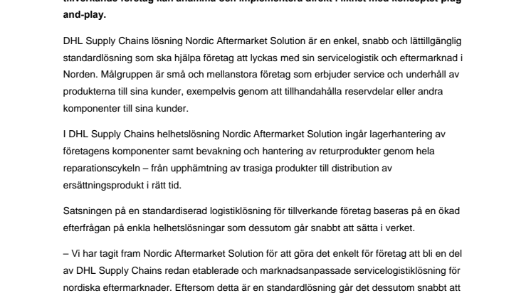 DHL Supply Chains lösning Nordic Aftermarket Solution är en enkel, snabb och lättillgänglig standardlösning som ska hjälpa företag att lyckas med sin servicelogistik och eftermarknad i Norden. Målgruppen är små och mellanstora företag som erbjuder service och underhåll av produkterna till sina kunder, exempelvis genom att tillhandahålla reservdelar eller andra komponenter till sina kunder.