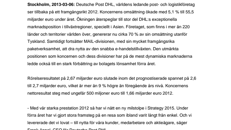 Stockholm, 2013-03-06: Deutsche Post DHL, världens ledande post- och logistikföretag ser tillbaka på ett framgångsrikt 2012. Koncernens omsättning ökade med 5,1 % till 55,5 miljarder euro under året. Ökningen återspeglar till stor del DHL:s exceptionella marknadsposition i tillväxtregioner, speciellt i Asien. Företaget, som finns i mer än 220 länder och territorier världen över, genererar nu cirka 70 % av sin omsättning utanför Tyskland. Samtidigt fortsätter MAIL-divisionen, med sin mycket framgångsrika paketverksamhet, att dra nytta av den snabba e-handelstillväxten. Den utmärkta positionen som koncernen och dess divisioner har på de mest dynamiska marknaderna ledde också till en stark förbättring av bolagets lönsamhet förra året.