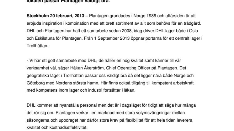 Stockholm 20 februari, 2013 – Plantagen grundades i Norge 1986 och affärsidén är att erbjuda inspiration i kombination med ett brett sortiment av allt som behövs för en trädgård. DHL och Plantagen har haft ett samarbete sedan 2008, idag driver DHL lager både i Oslo och Eskilstuna för Plantagen. Från 1 September 2013 öppnar portarna för ett centralt lager i Trollhättan.