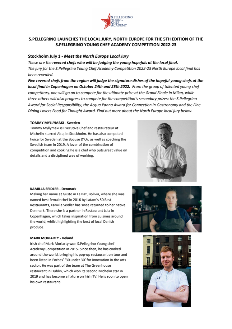 Nu är det klart att vår svenske stjärnkock, Tommy Myllymäki ingår som en av fem domare i juryn till regionsfinalen för norra Europa till S.Pellegrino Young Chef Academy Competition 2022-2023! Denna går av stapeln i Köpenhamn den 24 och 25 oktober och unga kockar från Danmark, Norge, Finland, Sverige, Irland, Nederländerna och Lettland kan komma att ingå bland de 15 finalisterna. Vinnaren går vidare till världsfinalen i Milano 2023.