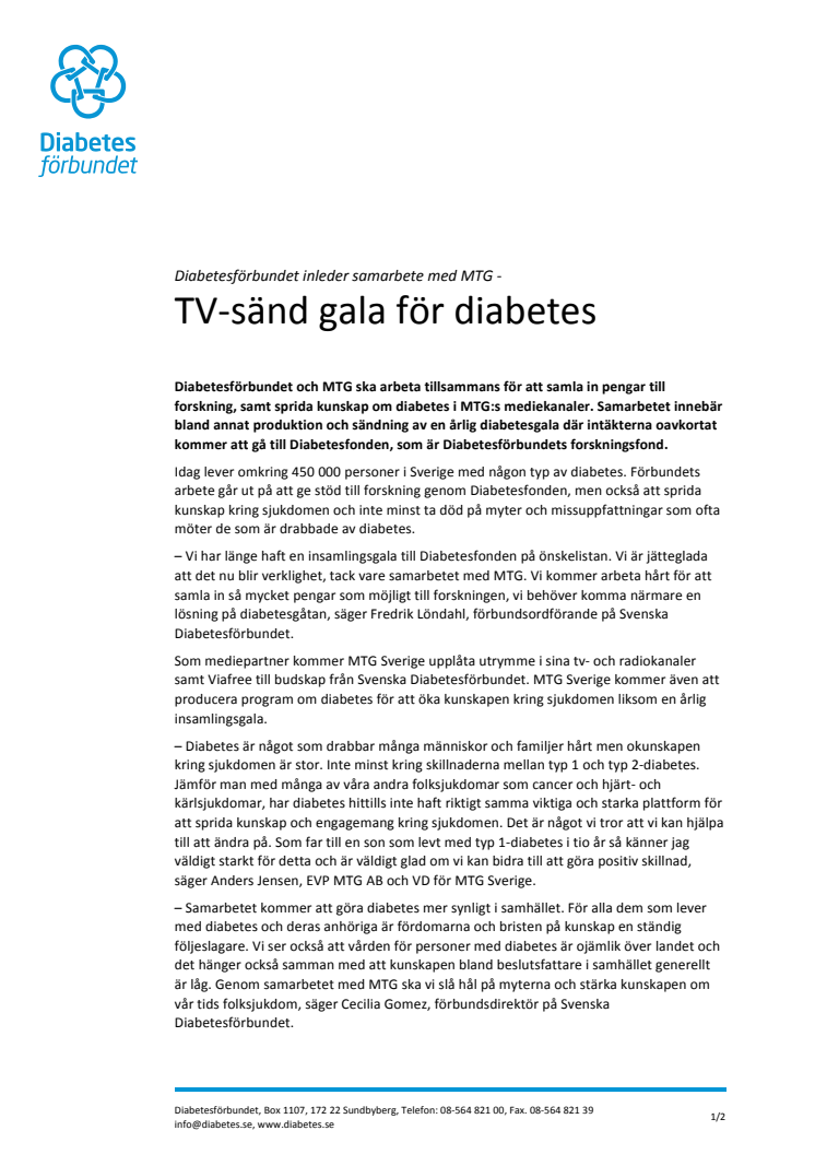 Diabetesförbundet och MTG ska arbeta tillsammans för att samla in pengar till forskning, samt sprida kunskap om diabetes i MTG:s mediekanaler. Samarbetet innebär bland annat produktion och sändning av en årlig diabetesgala där intäkterna oavkortat kommer att gå till Diabetesfonden, som är Diabetesförbundets forskningsfond.