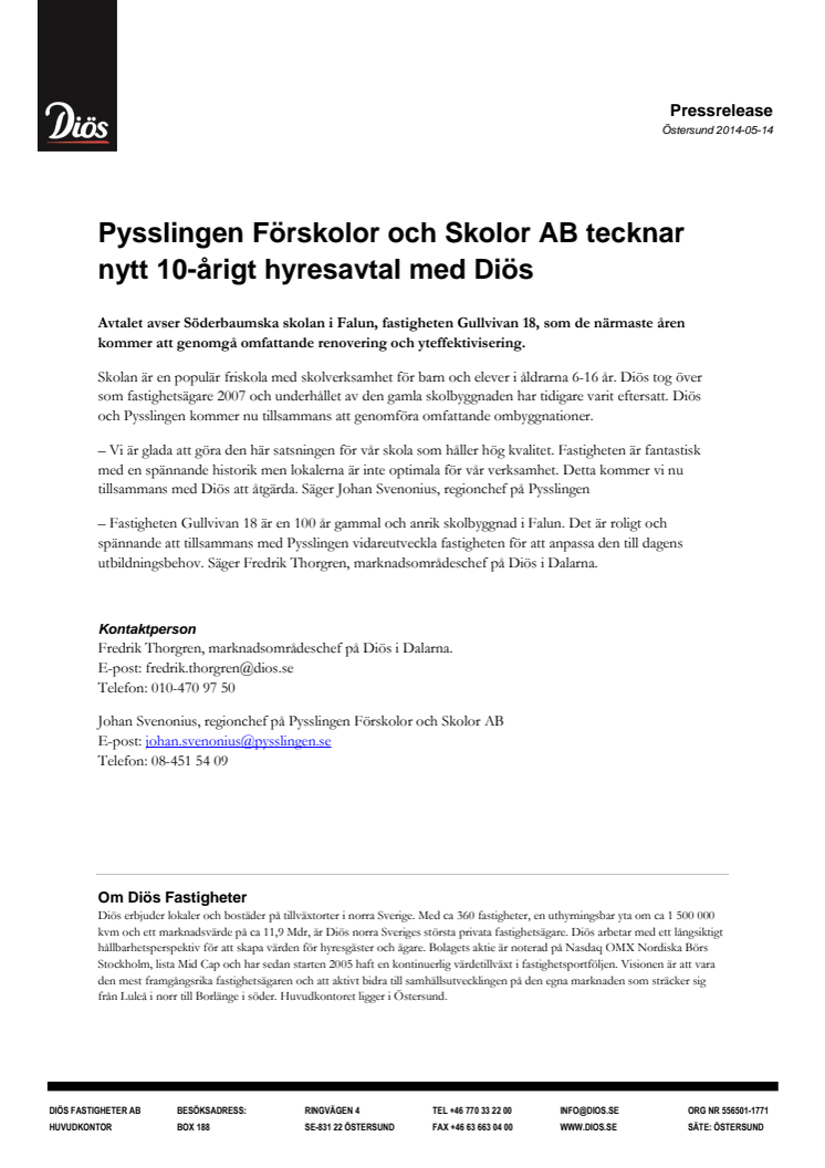 Pysslingen Förskolor och Skolor AB tecknar nytt 10-årigt hyresavtal med Diös