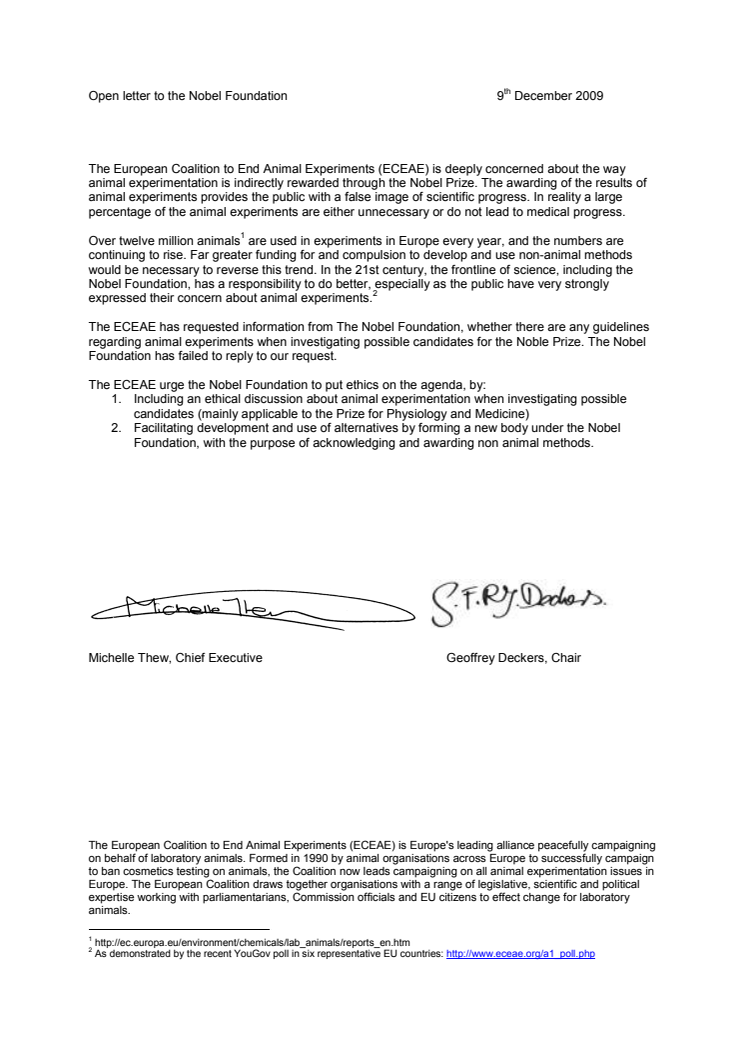 Nobelpriset förhärligar djurförsök. Det anser de 17 djurrätts- och djurskyddsorganisatonerna, som är medlemmar i den europeiska koalitionen ECEAE. I ett öppet brev efterlyser de ett ansvarstagande av Nobelstiftelsen.