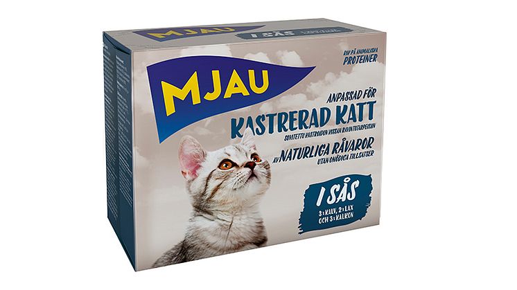 I Sverige är 9 av 10 katter kastrerade. En kastrerad katt får en sänkt ämnesomsättning, ökad aptit och blir dessutom mindre aktiv. För att undvika övervikt är det viktigt att anpassa fodret efter kattens nya behov. Därför finns Mjaus funktionsfoder för kastrerade inne- och utekatter med lägre energiinnehåll och lägre mineralhalt. Nu kompletterar man med ytterligare en produkt till produktfamiljen: Mjau multibox i sås med smak av lax, kalkon och kalv.