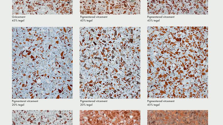 Tillsammans med Herrljunga Terrazzo AB inledde vi ett experiment: kan krossat tegel fungera som ballast i platsgjutet terrazzo? Resultatet blev 10 unika provplattor där vi testade olika kombinationer av varierande andel återbrukat tegel (från 80 % till 45 %), cementtyper och färgsättning. De mest lovande proverna innehöll 45 % återbrukat tegel som ballast och visar att det finns stor potential att skapa vackra, hållbara golv med material från platsen.
