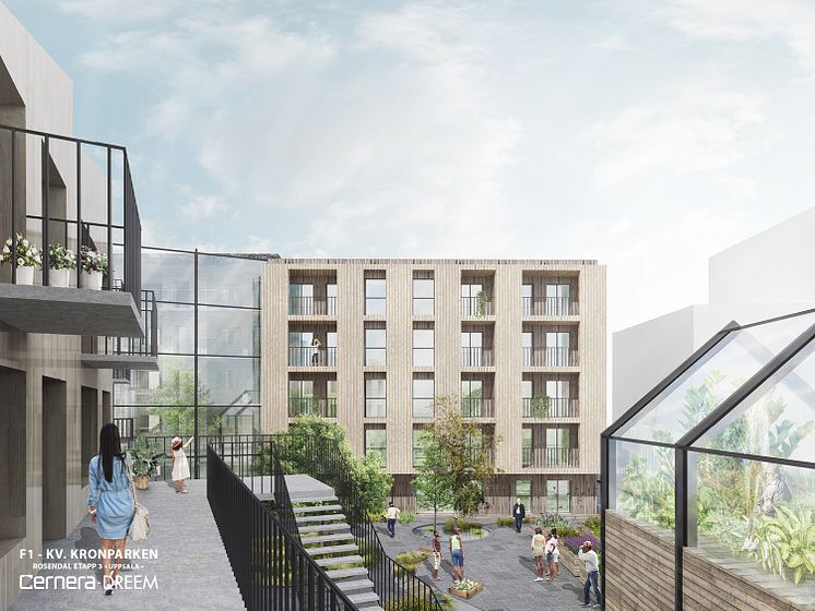 Vy från gård Kv. Kronparken, Rosendal Uppsala. Dreem Arkitekter