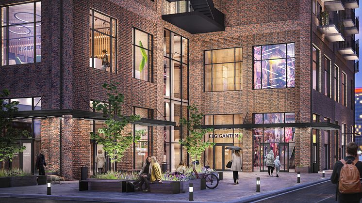 Fasader i tegel ger ett uttryck av en ruff materialitet med en industriell känsla, samtidigt som tegel i sig kommunicerar något tidlöst och bestående i kontrast till omgivande kommersiella byggnader. Indragna våningar görs till en del av taket genom fasadbeläggning i plåt lika taket.