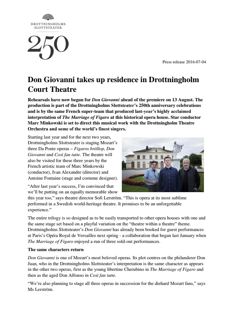 The entire trilogy is so designed as to be easily transported to other opera houses with one and the same stage set based on a playful variation on the “theatre within a theatre” theme. Drottningholms Slottsteater’s Don Giovanni has already been booked for guest performances at Paris’s Opéra Royal de Versailles next spring - a collaboration that began last January when The Marriage of Figaro enjoyed a run of three sold-out performances.