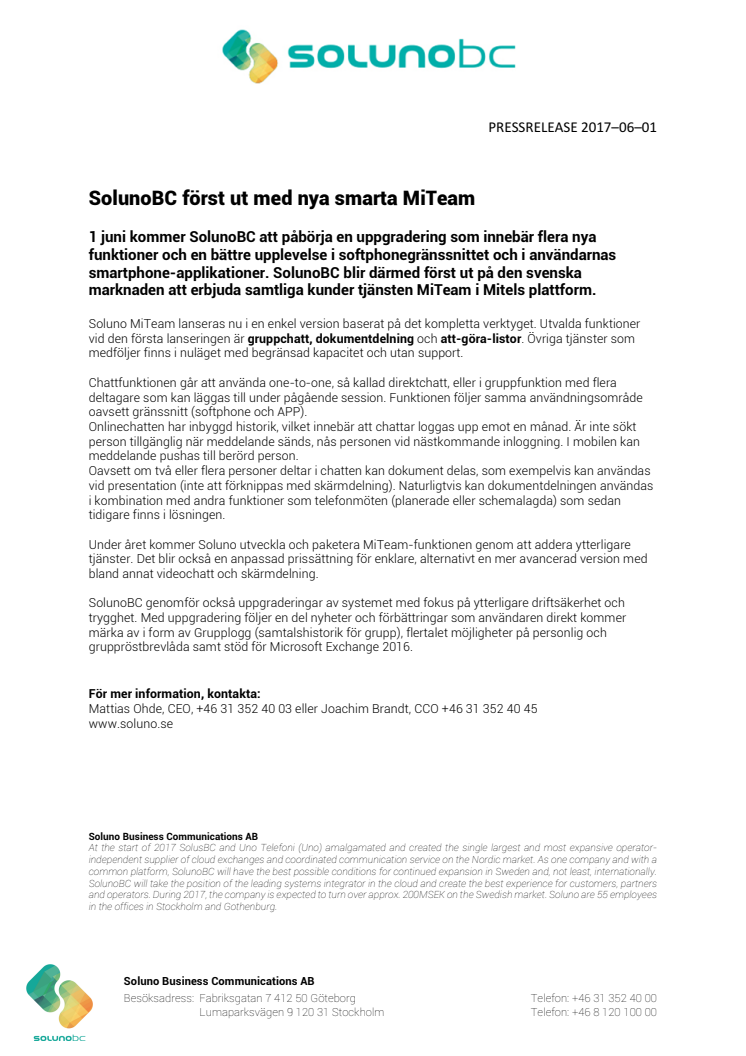 1 juni kommer SolunoBC att påbörja en uppgradering som innebär flera nya funktioner och en bättre upplevelse i softphonegränssnittet och i användarnas smartphone-applikationer. SolunoBC blir därmed först ut på den svenska marknaden att erbjuda samtliga kunder tjänsten MiTeam i Mitels plattform.