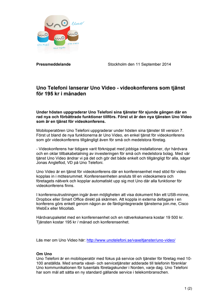 Under hösten uppgraderar Uno Telefoni sina tjänster för sjunde gången där en rad nya och förbättrade funktioner tillförs. Först ut är den nya tjänsten Uno Video som är en tjänst för videokonferens.